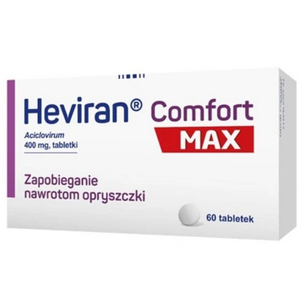 Each package contains 60 tablets of Gedeon Heviran Comfort Max 400 mg, along with clear usage instructions. This ensures safe, effective treatment and supports consistent symptom management during herpes outbreaks.
