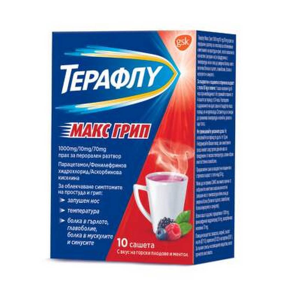 - — лекарственный препарат с парацетамолом, который отпускается без рецепта врача, для облегчения состояния при гриппе и кашле. Другими действующими веществами в препарате являются фенилэфрина гидрохлорид и гвайфенезин. Терафлю Макс снимает симптомы простуды, гриппа и гриппа, такие как слабая или умеренная боль, лихорадка, лихорадка, заложенность носа и продуктивный кашель. Лекарственный препарат предназначен для взрослых, пожилых пациентов и подростков в возрасте от 16 лет и старше, весом 50 кг и более. Выпускается в виде разовых доз в пакетиках для легкого приготовления горячего напитка.