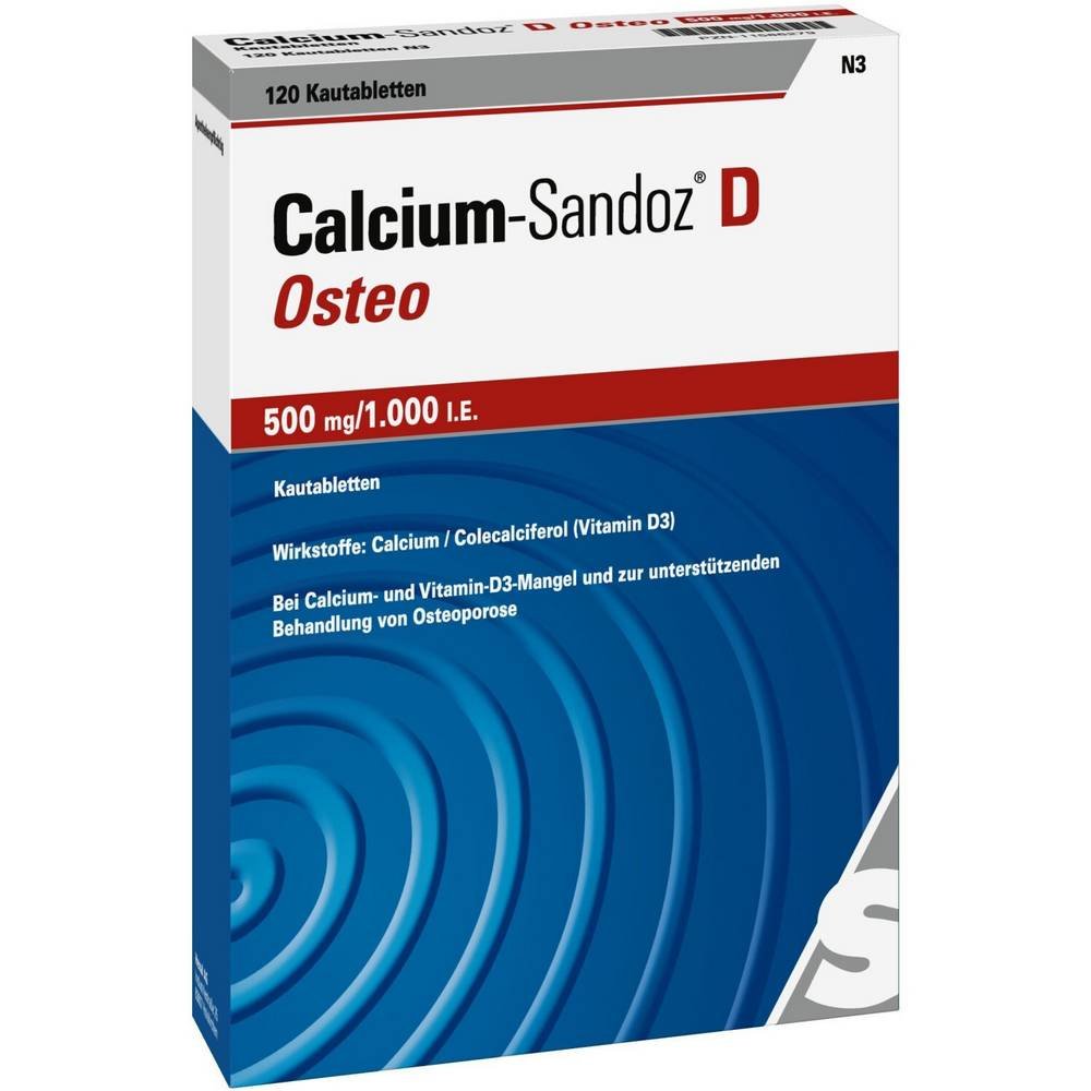 Hexal CALCIUM SANDOZ D Osteo, calcium supplement, vitamin D3, bone health, osteoporosis prevention, skeletal support, 500 mg, 1,000 IU, 120 tablets.