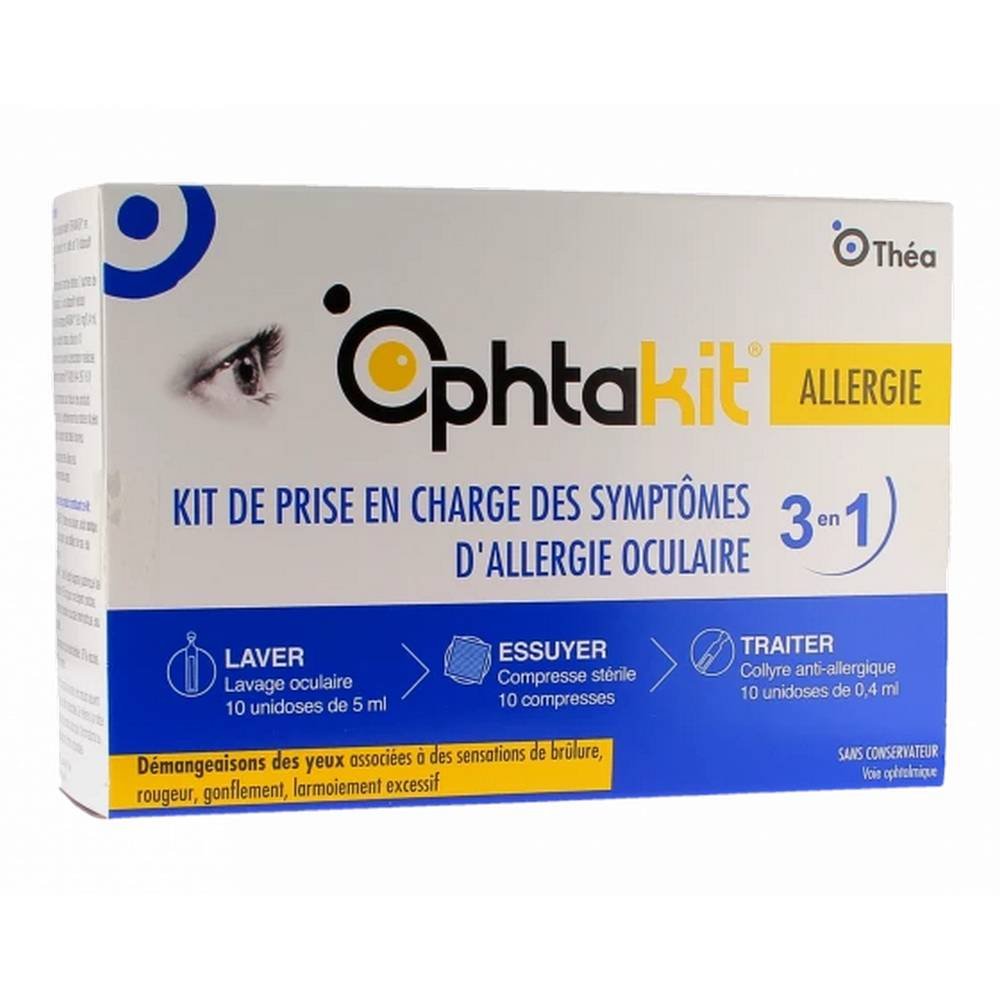 Kit 3-en-1 de gestion des symptômes d’allergie Ophtakit contient un médicament, Naabak anti -gouttes oculaires contre les allergies en doses uniques, Theawash dispositif médical en doses uniques pour le collyre et deux sachets de compresses .
